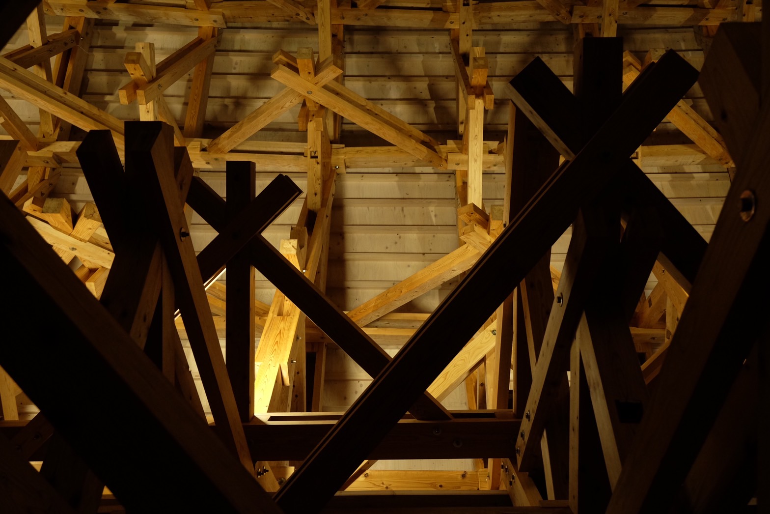 熊本県産の小国杉を使い材長5m以下の小中径製材が互いにもたれかかるように支え合う「木造レシプロカル構造」により、新しい木造無柱空間が実現した。木造建築産業のさらなる