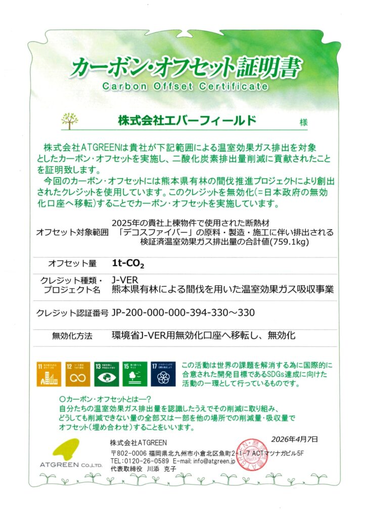 2025年分(2025/1/1~2025/12/31)に使用した断熱材について、カーボンオフセットを実施いたしました。