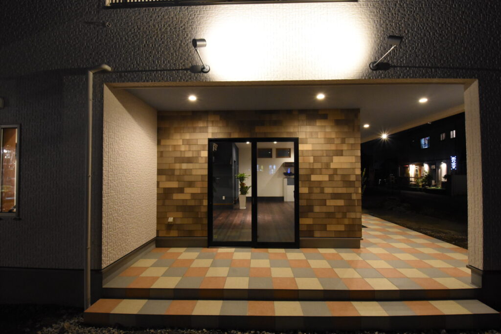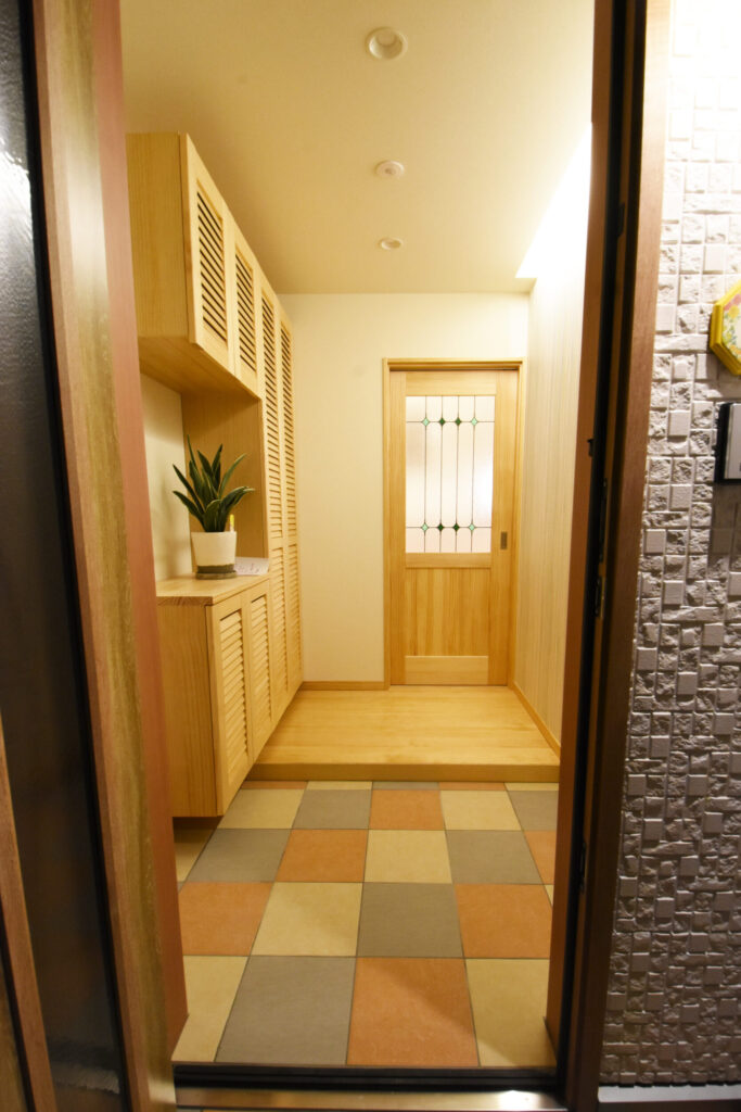 玄関は3色のタイルで楽しい足元をデザイン。