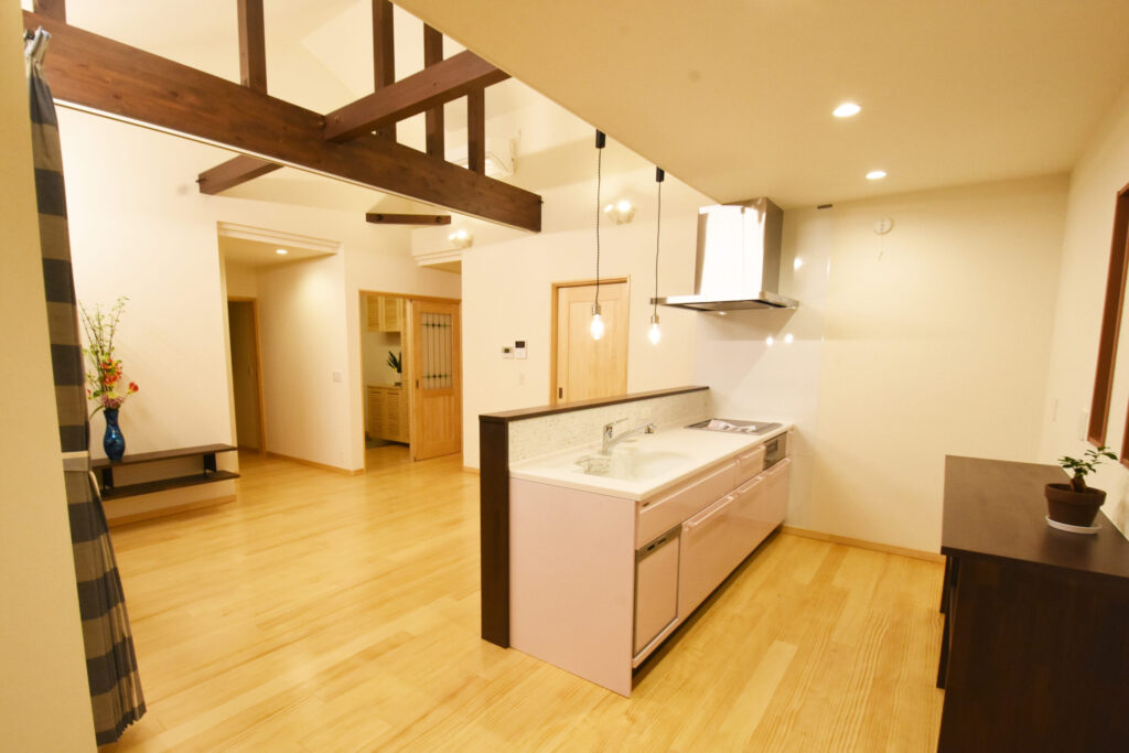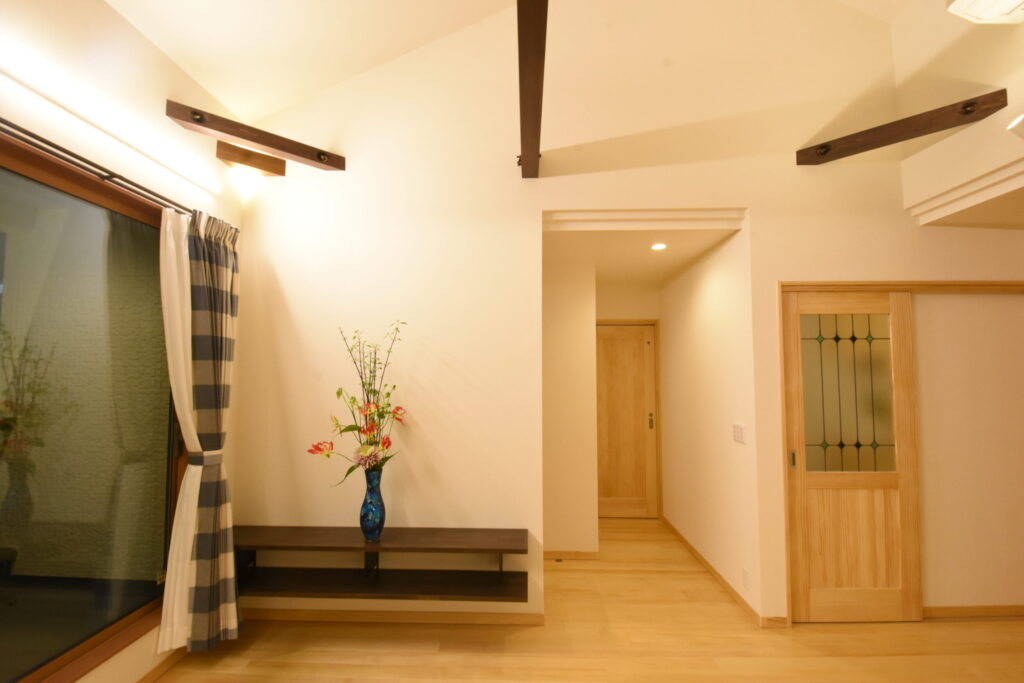 リビングは化粧梁が空間のリズムをつくり、やわらかな照明が天井面をなでるように広がります。