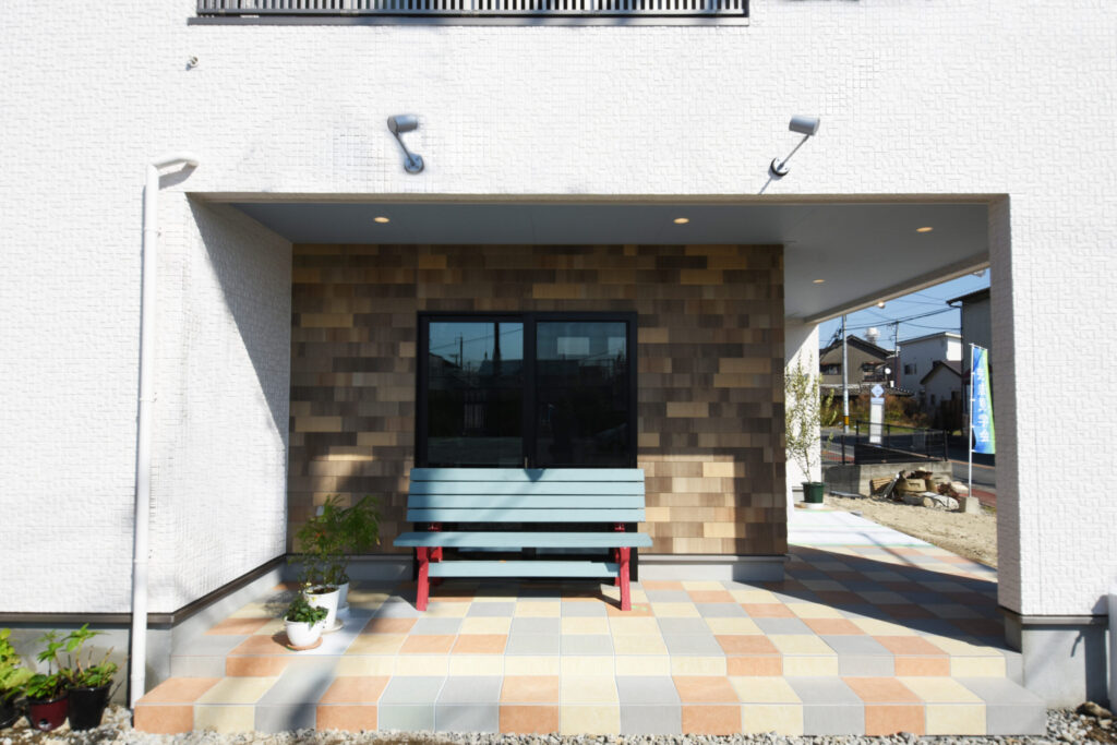 屋根のかかったポーチはベンチを置ける奥行きを確保し、季節の鉢植えが映える“迎えの余白”になっています。