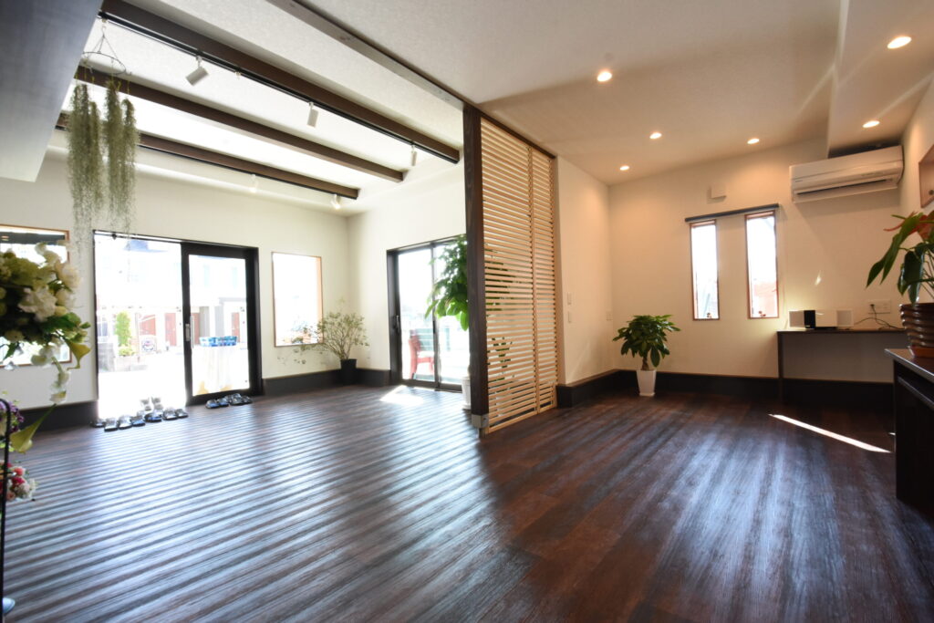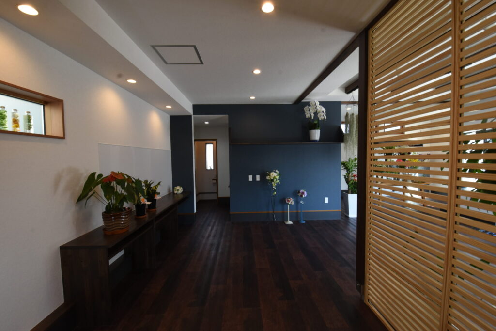 来客動線は、引き込み戸の先に広がるホールから奥の作業スペースへと緩やかにつながり、視線は木製ルーバーの引き戸でやさしくコントロール。