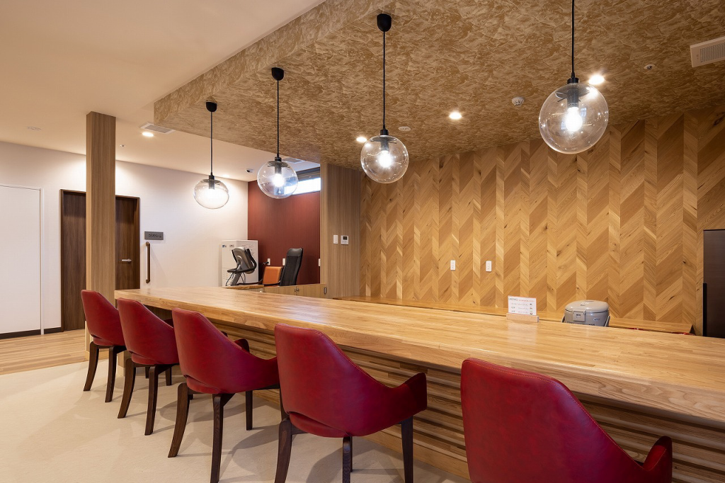 設計者の公開情報では、内装を「木」をキーにまとめたと紹介されています。施工では木部の継ぎ目・角の納まり・見え掛かりの精度を揃え、長く使われる施設としての質感を整えました。