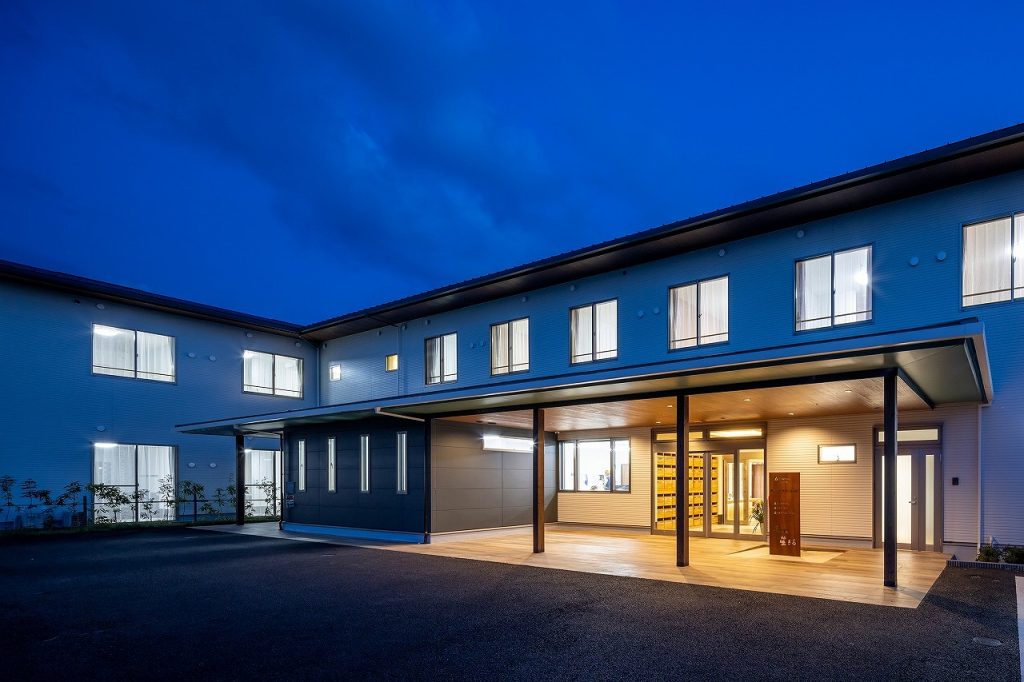 主要構造は木造、地上2階建て(準耐火建築物)で、地域の風景に馴染む落ち着いた佇まいが印象的です。