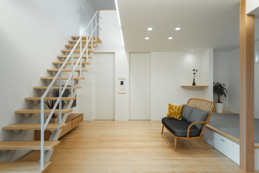 オープン階段と吹抜けが上下のつながりを生み、日中の光が室内にやわらかく回ります。