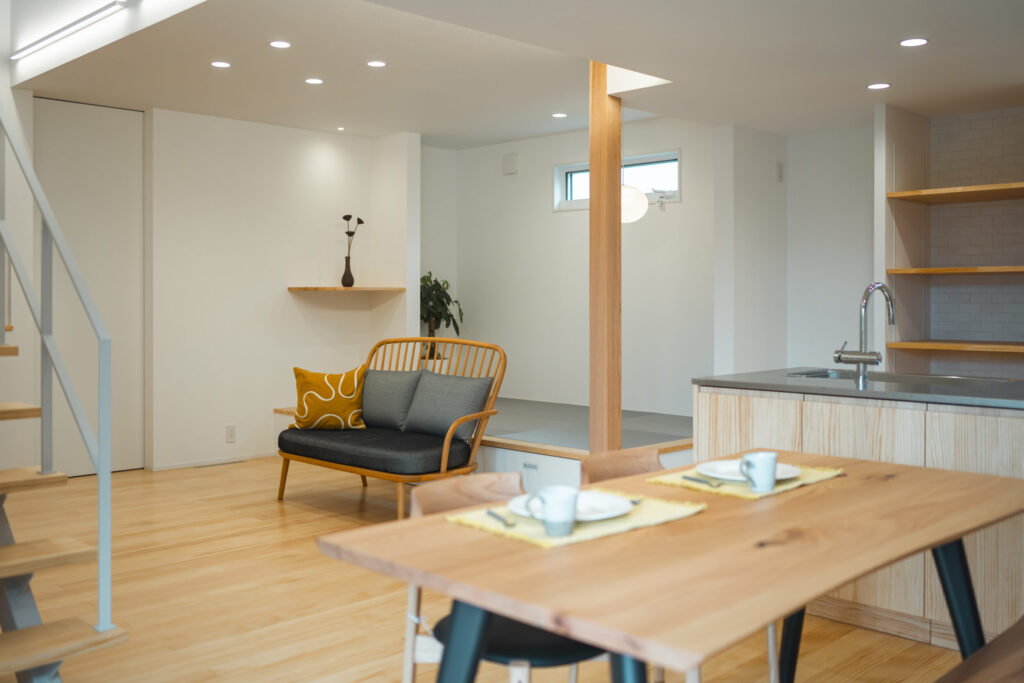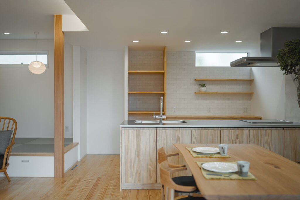 視線が抜け、キッチンからリビング、畳スペース、お庭まで見渡せる間取りは、家族の気配を感じながら、あたたかく見守れる住まいをかたちにしています。