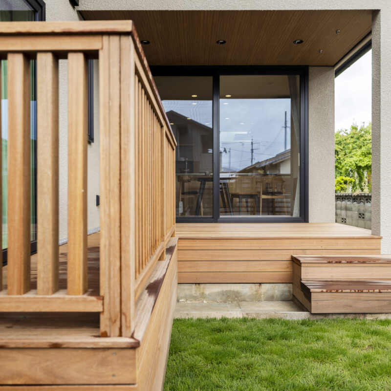 デッキは深い庇の下に設け、天候の変化を受けにくい外の居場所として計画。