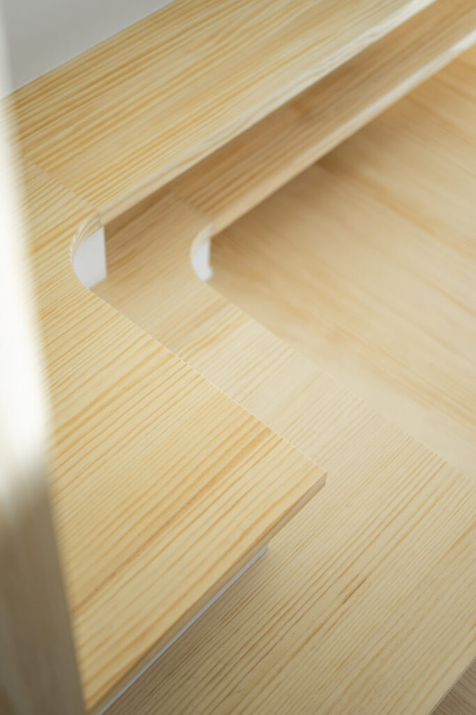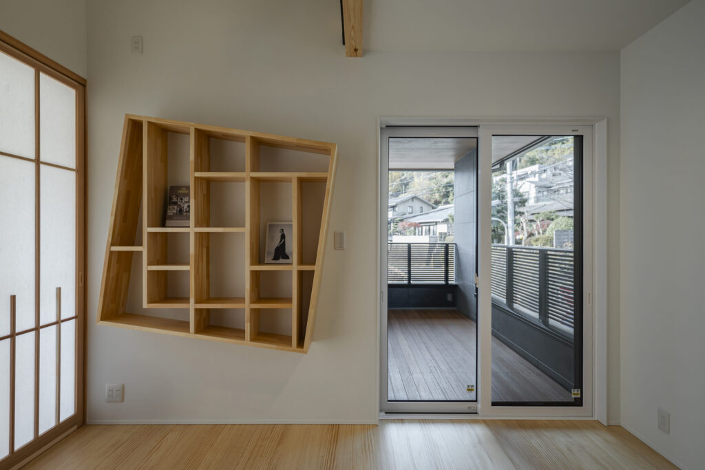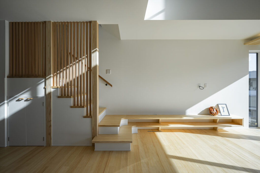 階段の1段目・2段目から伸びるように構成したテレビ台や、2階仕事部屋の個性的な飾り棚など、暮らしの背景を整えながら“飾る・見せる”楽しみも受け止める設えとしました。