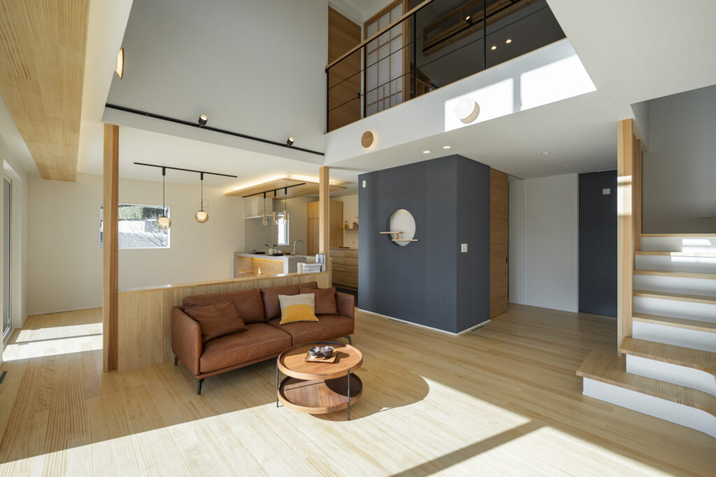 LDKは、掃き出し窓2か所に加え、2階の窓からの光を吹抜けを通して取り込むことで、時間帯ごとに明るさの表情が変わる開放的な空間に。