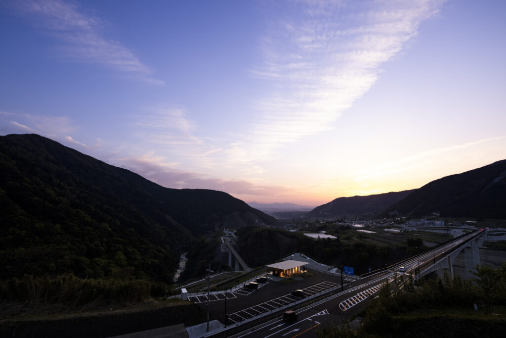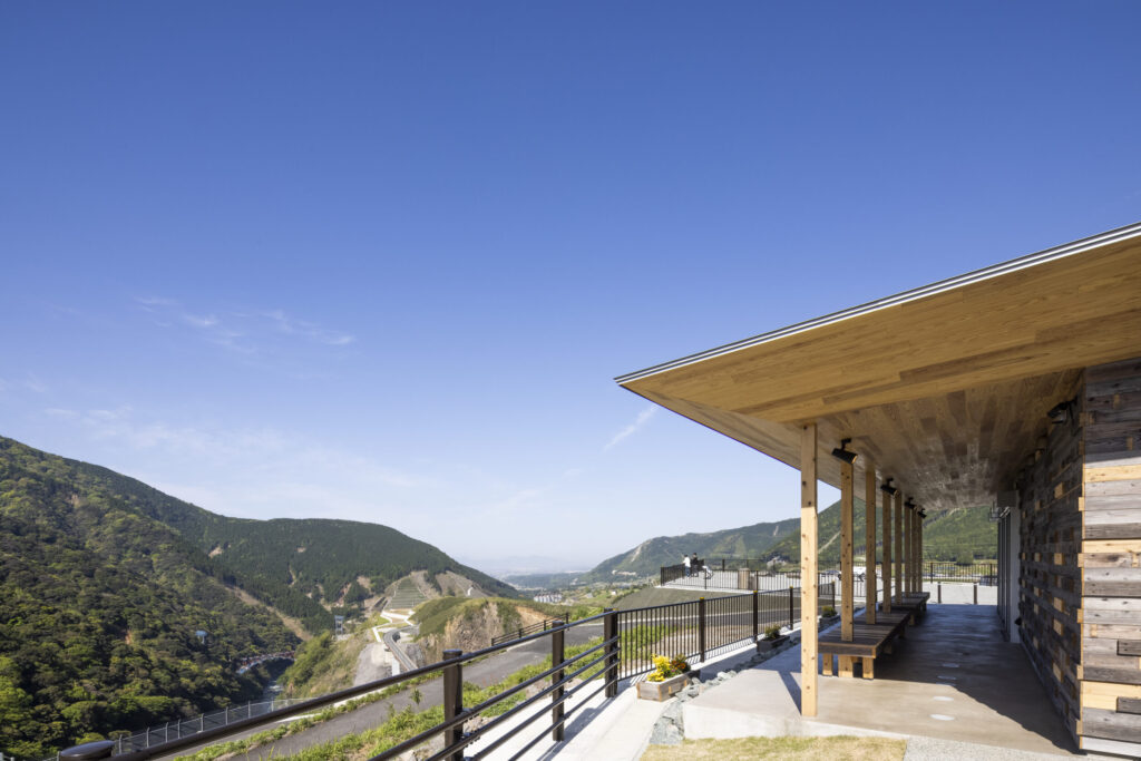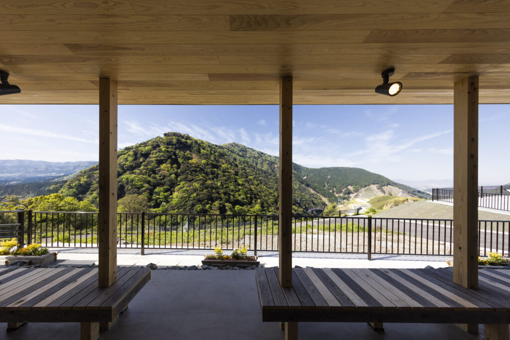 阿蘇の雄大な景色に開かれた展望拠点に、熊本地震の被災地で地域の集いを支えた仮設木造施設「みんなの家」を移築・再生した休憩施設です。